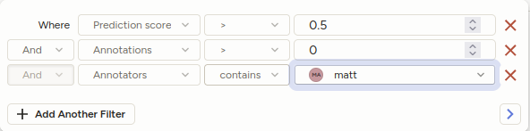 In Label Studio Enterprise and Starter Cloud, you can use advanced filters against annotation results. For more information, see our Enterprise documentation.